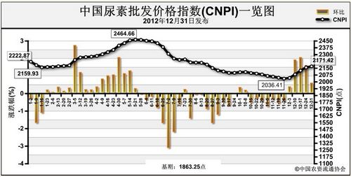 12月31日中國尿素批發(fā)價格指數(shù)(CNPI)為2171.42點環(huán)比上漲12.43點,漲幅為0.58%;同比下跌51.45點,跌幅為2.31%;比基期上漲308.17點,漲幅為16.54%;
